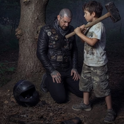 El sol se ocultaba tras las montañas, proyectando sombras alargadas sobre el claro del bosque donde un motociclista llamado «Rocco» permanecía inmovilizado. Un grupo de maleantes locales, tras una disputa por territorio, lo habían dejado indefenso, asegurando su cuerpo al tronco de un roble centenario. Las pesadas argollas de hierro le apretaban las muñecas y los tobillos, cortándole la circulación. De pronto, entre los arbustos, emergió una figura pequeña cargando una herramienta que parecía pesar más que él. Un niño de mirada triste pero decidida se plantó frente al prisionero. Rocco, sorprendido por la aparición, le preguntó con voz ronca: «¿Qué haces niño? ¿Quién eres?». El pequeño, sin soltar el mango de madera, respondió con una madurez que no correspondía a su edad: «Soy Bastián, señor, y lo ayudaré. Vi cuando ellos lo dejaron aquí».