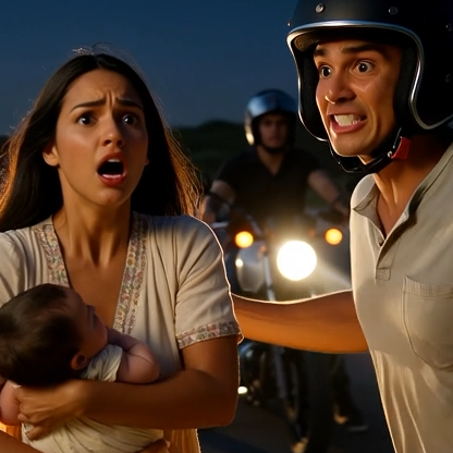 La carretera nacional estaba sumida en una oscuridad absoluta, rota únicamente por el haz de luz de las motocicletas que cortaban el aire frío de la medianoche. El estruendo de los motores era lo único que llenaba el vacío del desierto hasta que, de repente, una figura desesperada emergió de entre los matorrales. Una mujer en la carretera con su hijo en brazos pide ayuda a unos motociclistas que pasan por ahí. Frenando en seco y dejando una marca de caucho quemado en el asfalto, el líder del grupo, un hombre de aspecto rudo llamado «Sombra», se bajó de su máquina. La mujer temblaba violentamente, sus ropas estaban desgarradas y sus ojos reflejaban un terror que no parecía de este mundo. «¡Auxilio por favor, llévense a mi hijo!», suplicó ella, extendiendo al pequeño envuelto en una manta blanca. Sombra, desconcertado por la urgencia del pedido, se quitó el casco. «¿Qué es lo que está pasando? ¿Por qué está tan asustada, señora?», preguntó mientras, por puro instinto de protección, el hombre agarra al bebé con firmeza pero delicadeza.