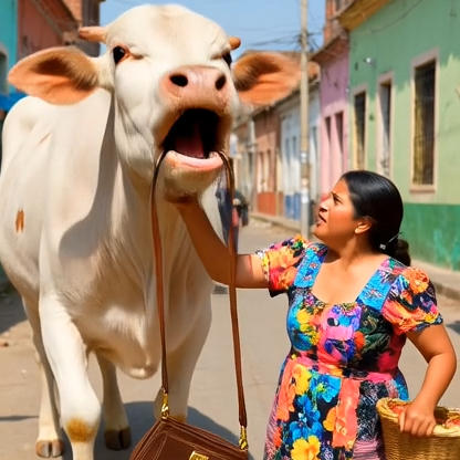 En la acera principal de la ciudad, frente a un banco de alta seguridad, una mujer elegante caminaba apresurada sosteniendo un bolso de cuero negro contra su pecho. De la nada, una vaca que deambulaba por el asfalto se interpuso en su camino con una mirada fija y penetrante. Antes de que la mujer pudiera reaccionar, el animal estiró el cuello y, con una fuerza sorprendente, le arrebató el bolso de las manos usando sus dientes. La mujer cayó con fuerza en el suelo del impacto, gritando por ayuda mientras veía cómo el animal emprendía una carrera frenética hacia el centro del distrito financiero.